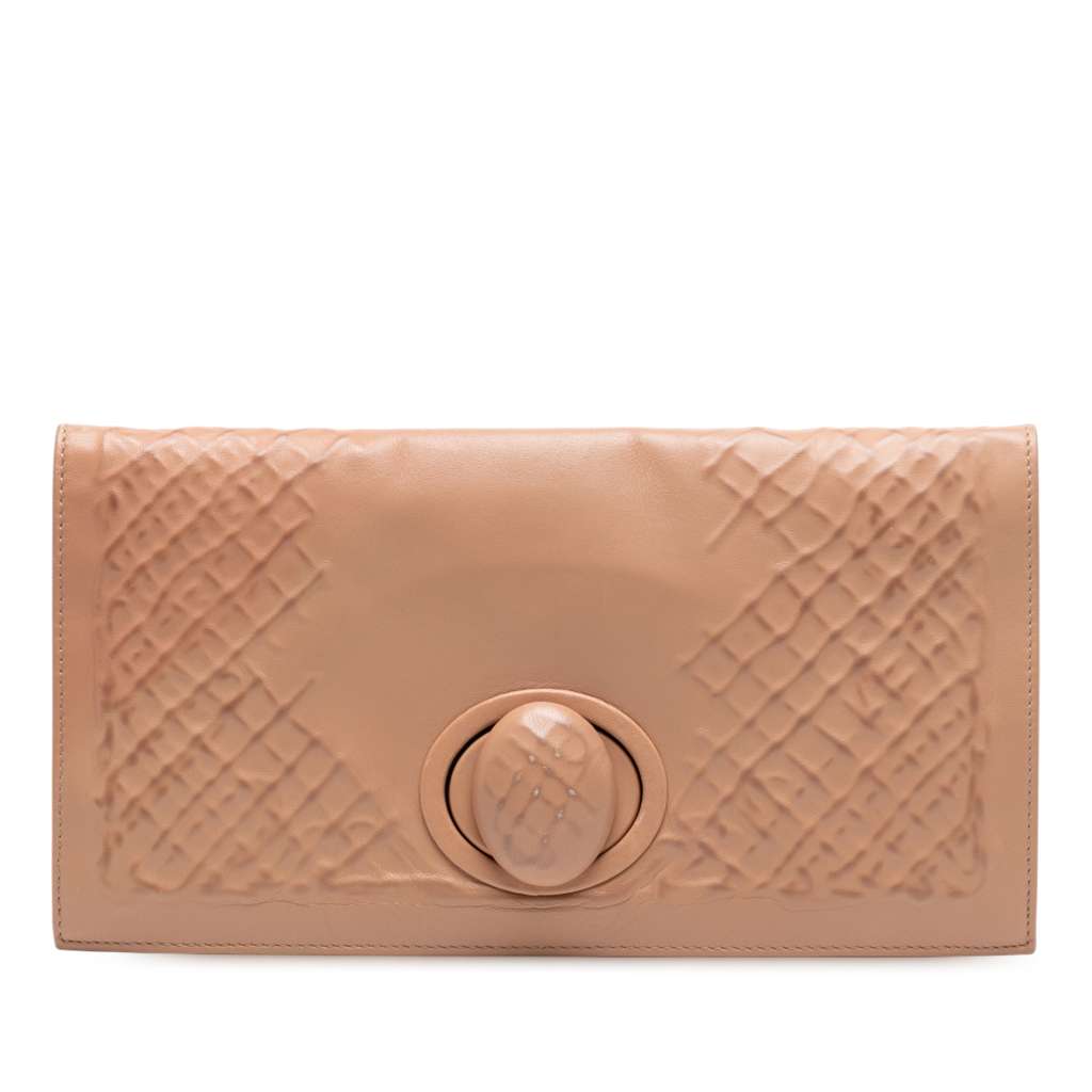 This clutch bag features an embossed leather body, a front flap with turnlock closure, and an interior zip closure.