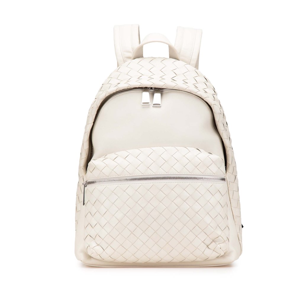 This backpack features a woven leather body, a flat top handle, flat leather back straps, a top zip closure, an exterior front zip compartment, an interior laptop compartment, and interior zip and slip pockets.