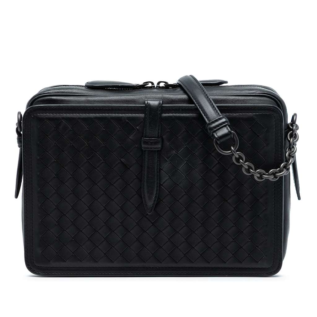 This shoulder bag features a woven leather body, a chain and leather shoulder strap, exterior front and back compartments with top strap closures, a top zip closure, and an interior slip pocket.