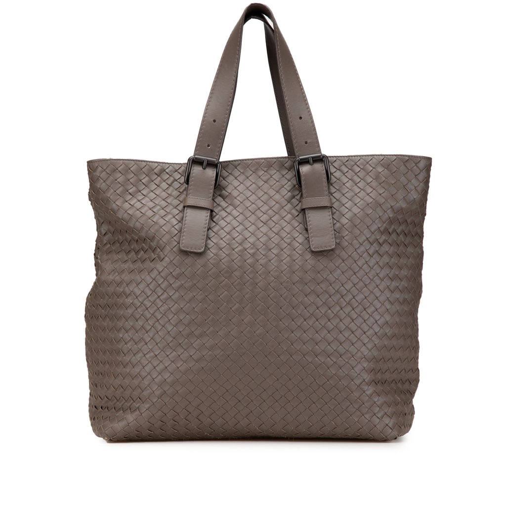 This tote bag features a woven leather body, rolled leather handles, an open top, and an interior zip pocket.