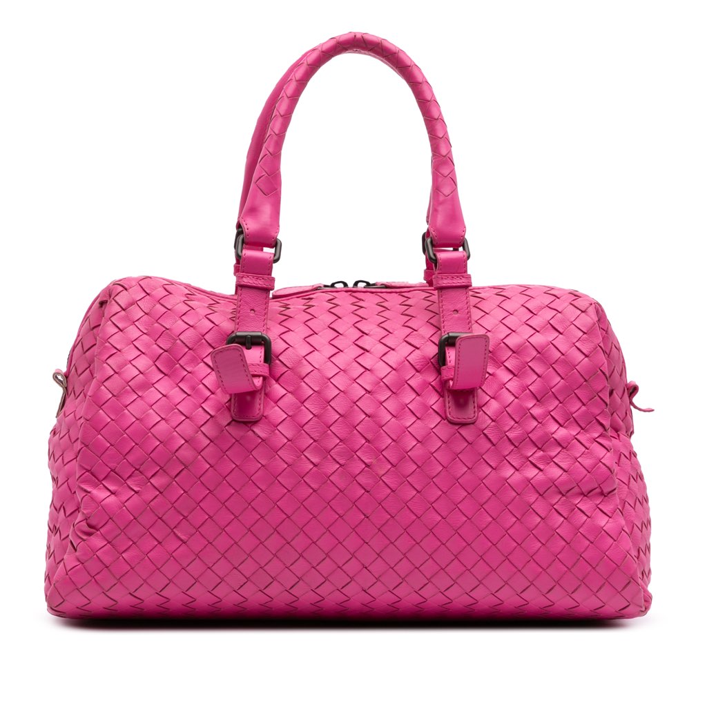 This boston bag features a woven nappa leather body, adjustable rolled leather handles, a top zip closure, and an interior zip pocket.