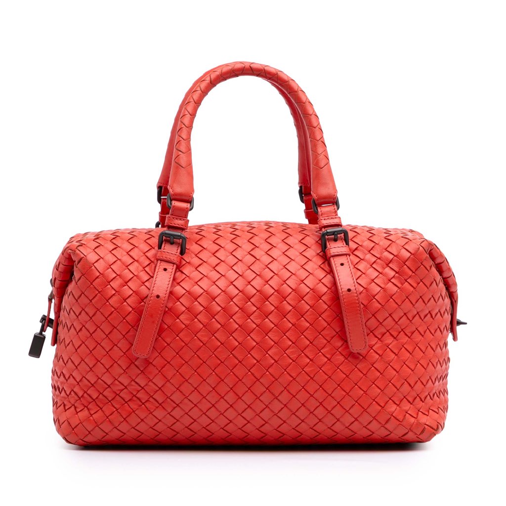 This boston bag features a woven nappa leather body, adjustable rolled leather handles, a top zip closure, and an interior zip pocket.