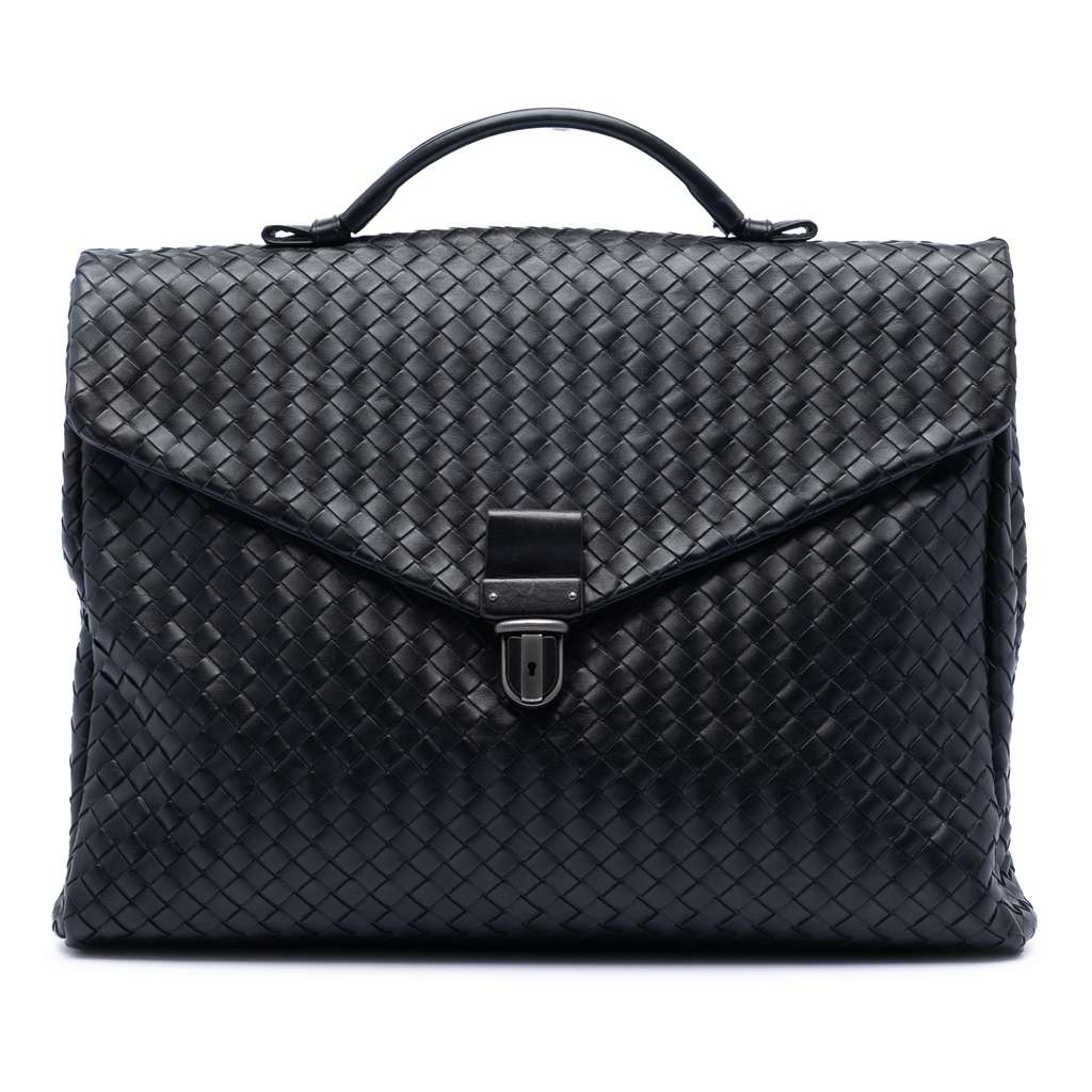 This business bag features a woven nappa leather body, a flat leather top handle, a front flap with a push lock closure, and an exterior back zip pocket.