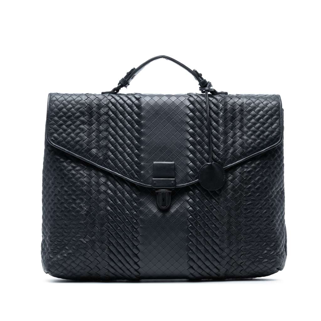 This business bag features a woven nappa leather body, a flat leather top handle, a front flap with a push lock closure, and an interior zip pocket.