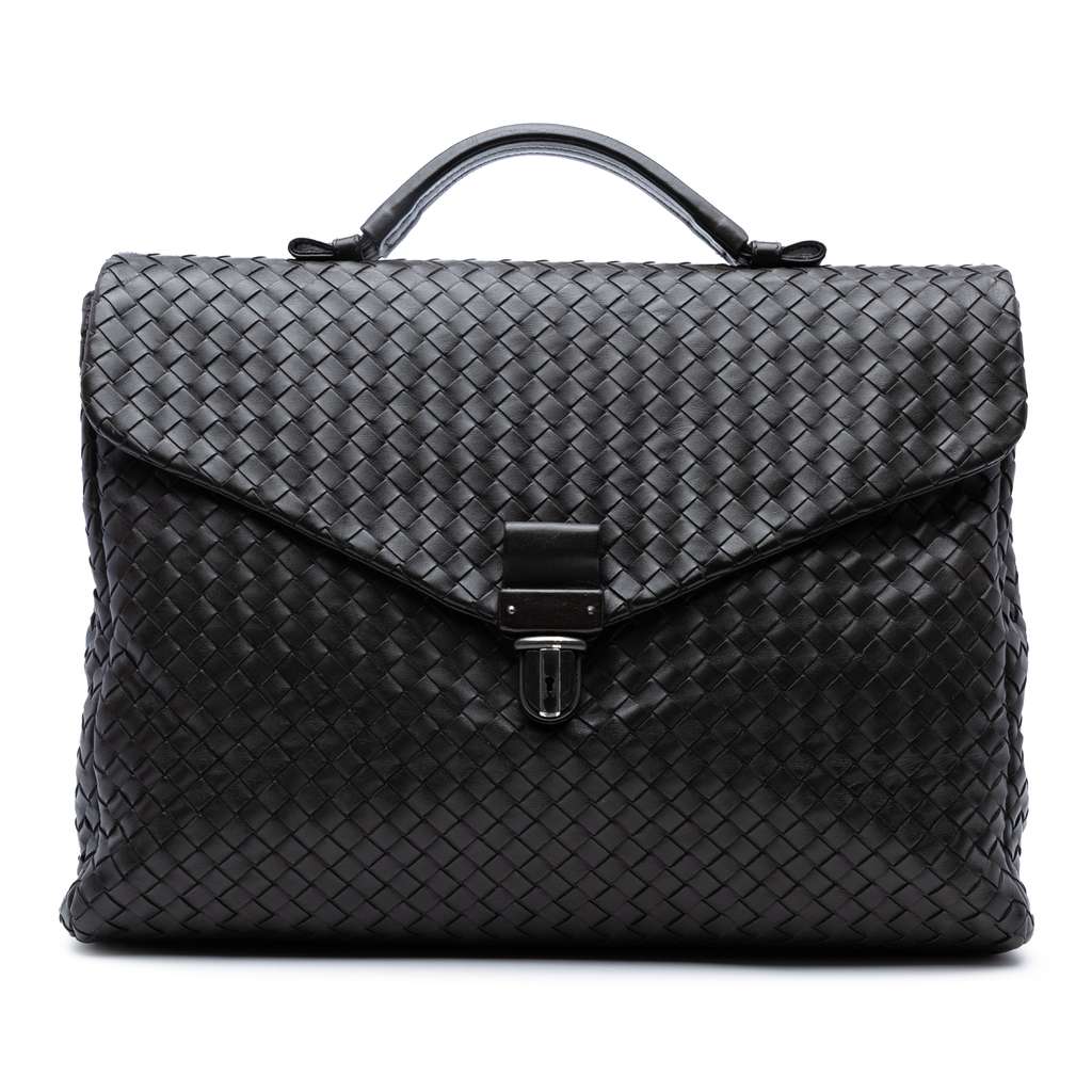 This business bag features a woven nappa leather body, a flat leather top handle, a front flap with a push lock closure, and an exterior back zip pocket.