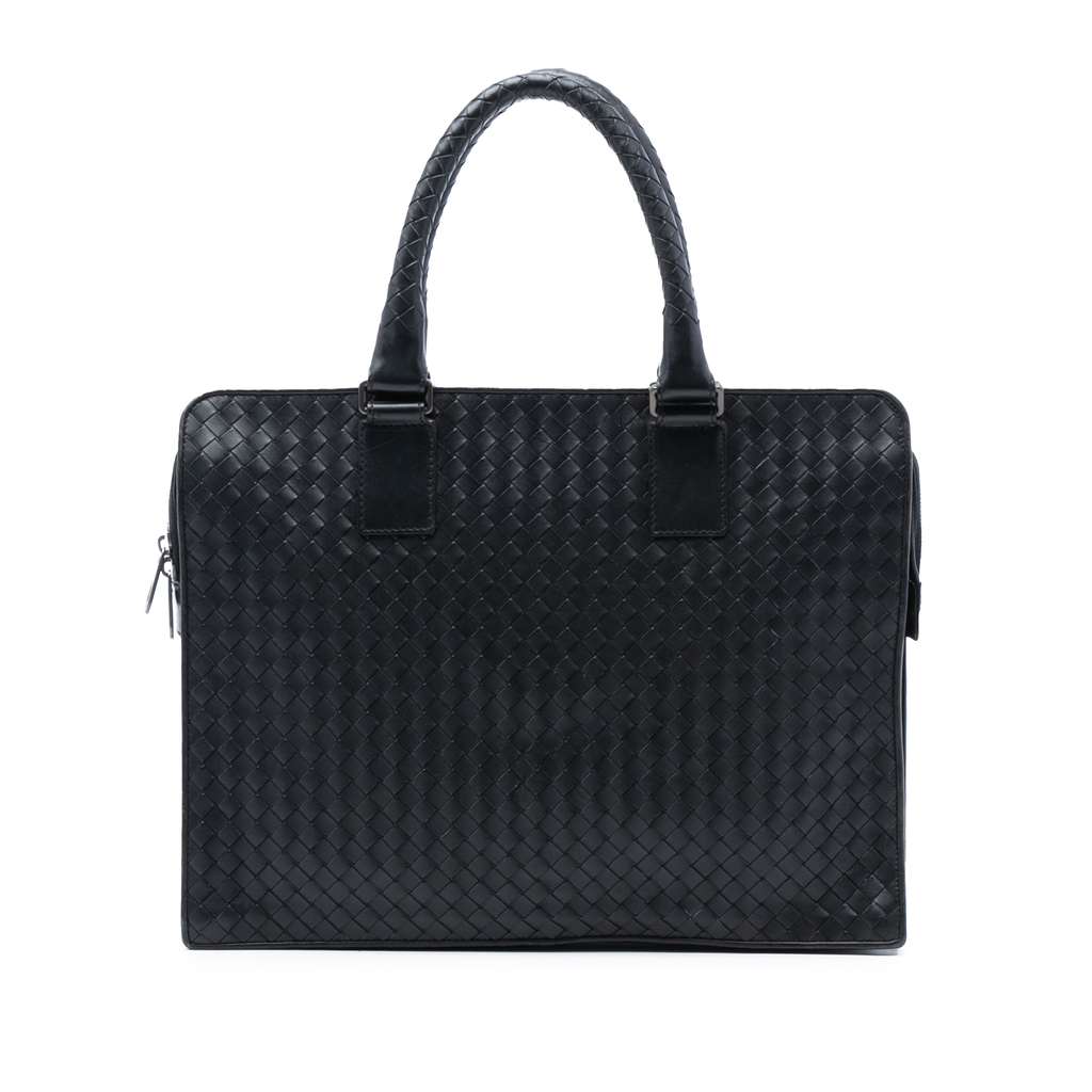 This business bag features a woven nappa leather body, rolled handles, a top zip closure, and interior slip compartments.