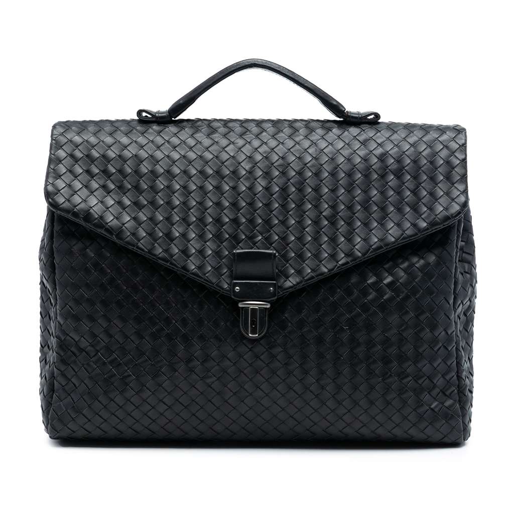 This business bag features a woven nappa leather body, a flat leather handle, a front flap with a push lock closure, and an exterior back zip compartment.