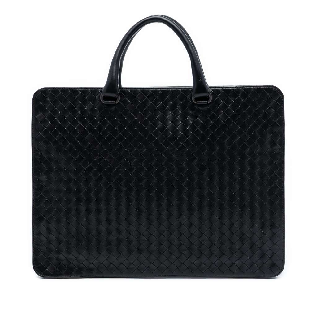 This business bag features a woven leather body, rolled handles, a top zip closure, and interior slip pockets.