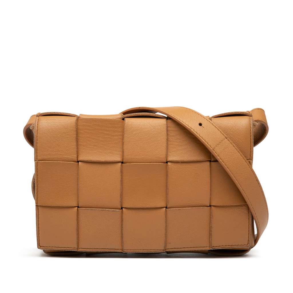 The Cassette features a woven nappa leather body, an adjustable flat leather shoulder strap, a front flap with magnetic snap closure, and an interior zip pocket.