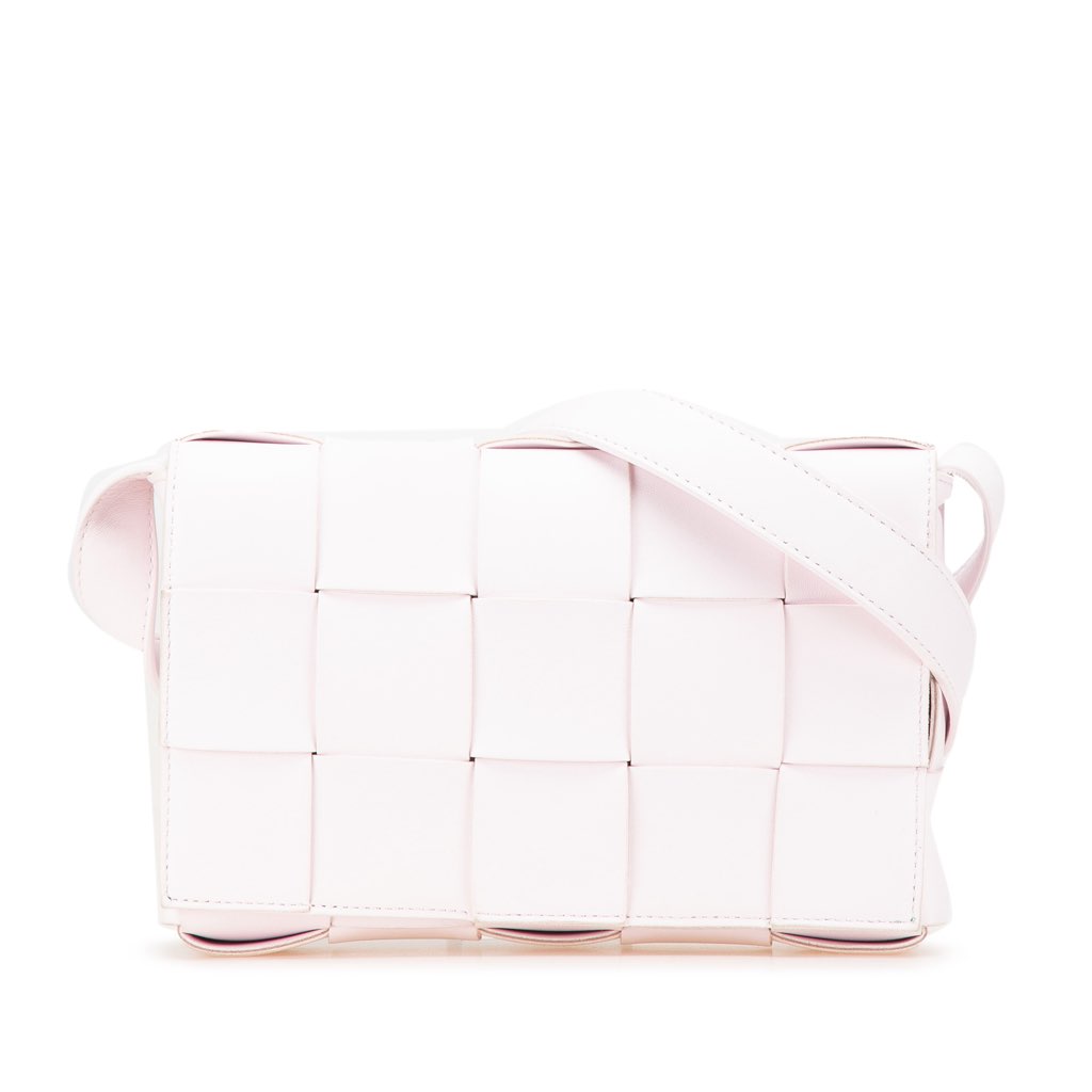 The Cassette features a woven nappa leather body, a flat leather shoulder strap, a front flap with magnetic snap closure, and an interior zip pocket.