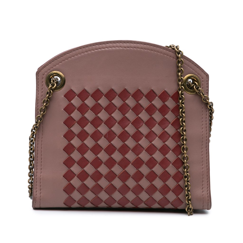 This chain wallet features a nappa leather body with woven details, chain link straps with leather shoulder guard, an open top, an interior zip compartment, and interior slip pockets.