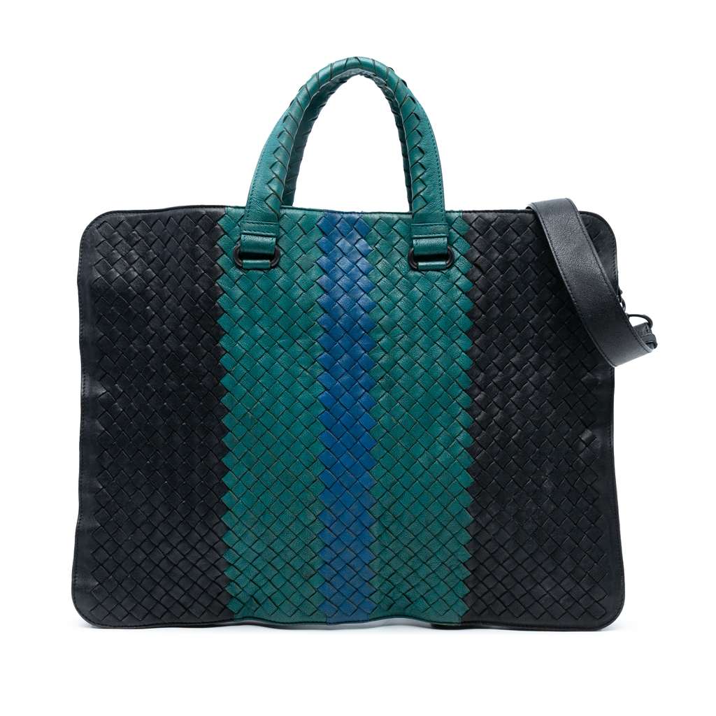 This business bag features a woven leather body, flat handles, a detachable strap, an open top, an interior zip compartment, and interior slip pockets.