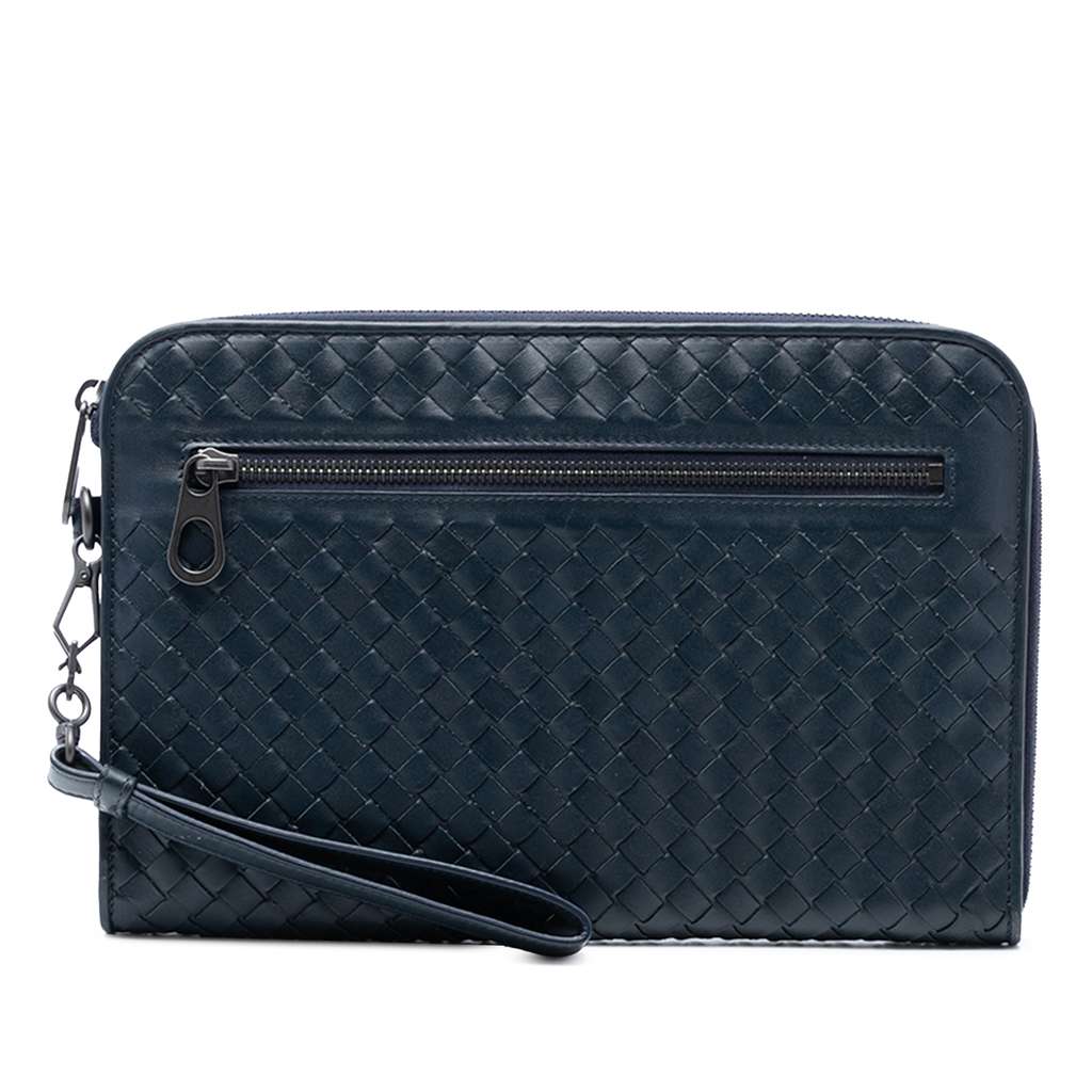 This clutch bag features a woven leather body, a detachable flat wrist strap, a zip-around closure, an exterior zip pocket, and interior slip pockets.