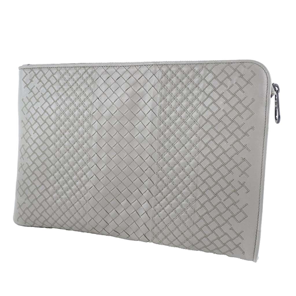 This clutch bag features a woven leather body, a top zip closure, an exterior zip pocket, and interior slip pockets.