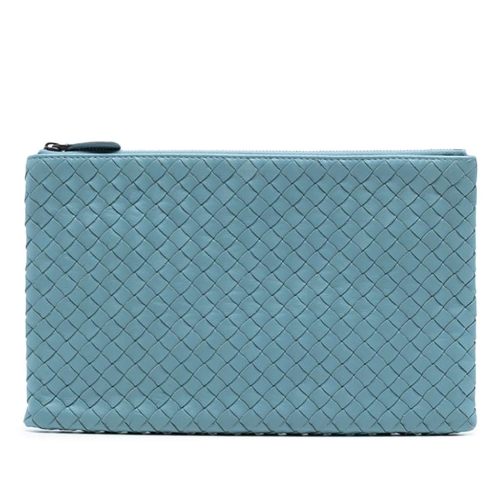 This clutch bag features a woven nappa leather body, and a top zip closure.