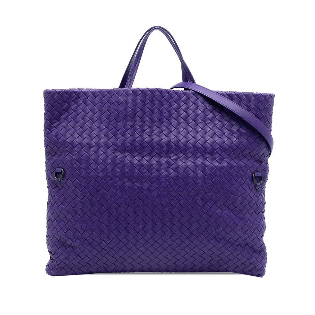 This satchel features a woven leather body, flat leather handles, a detachable flat leather shoulder strap, an open top, and an interior zip pocket.