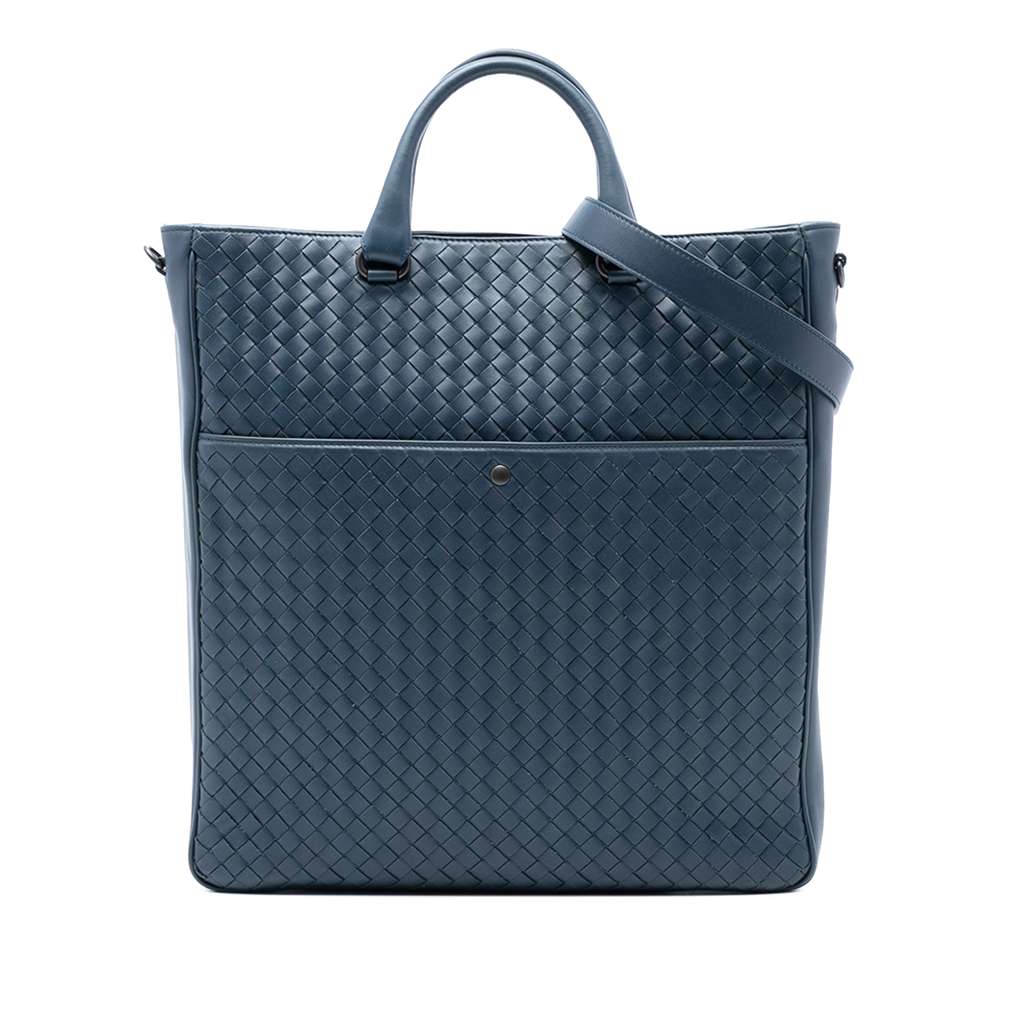 This satchel features a woven leather body, rolled leather top handles, a detachable flat leather strap, a top zip closure, an exterior front slip pocket with snap button closure, and an interior zip pocket.