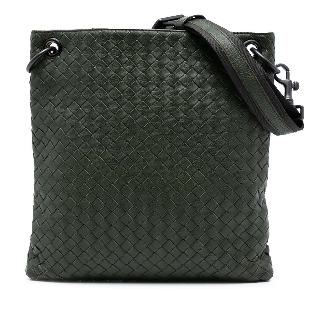 This crossbody bag features a woven leather body, an adjustable flat shoulder strap, an open top, and an interior zip pocket.