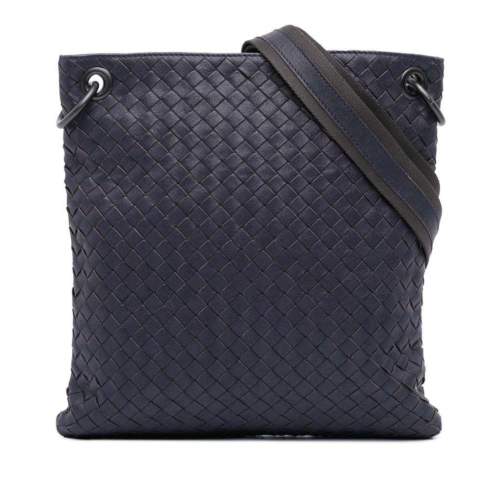 This crossbody bag features a woven leather body, an adjustable flat shoulder strap, an open top, and an interior zip pocket.