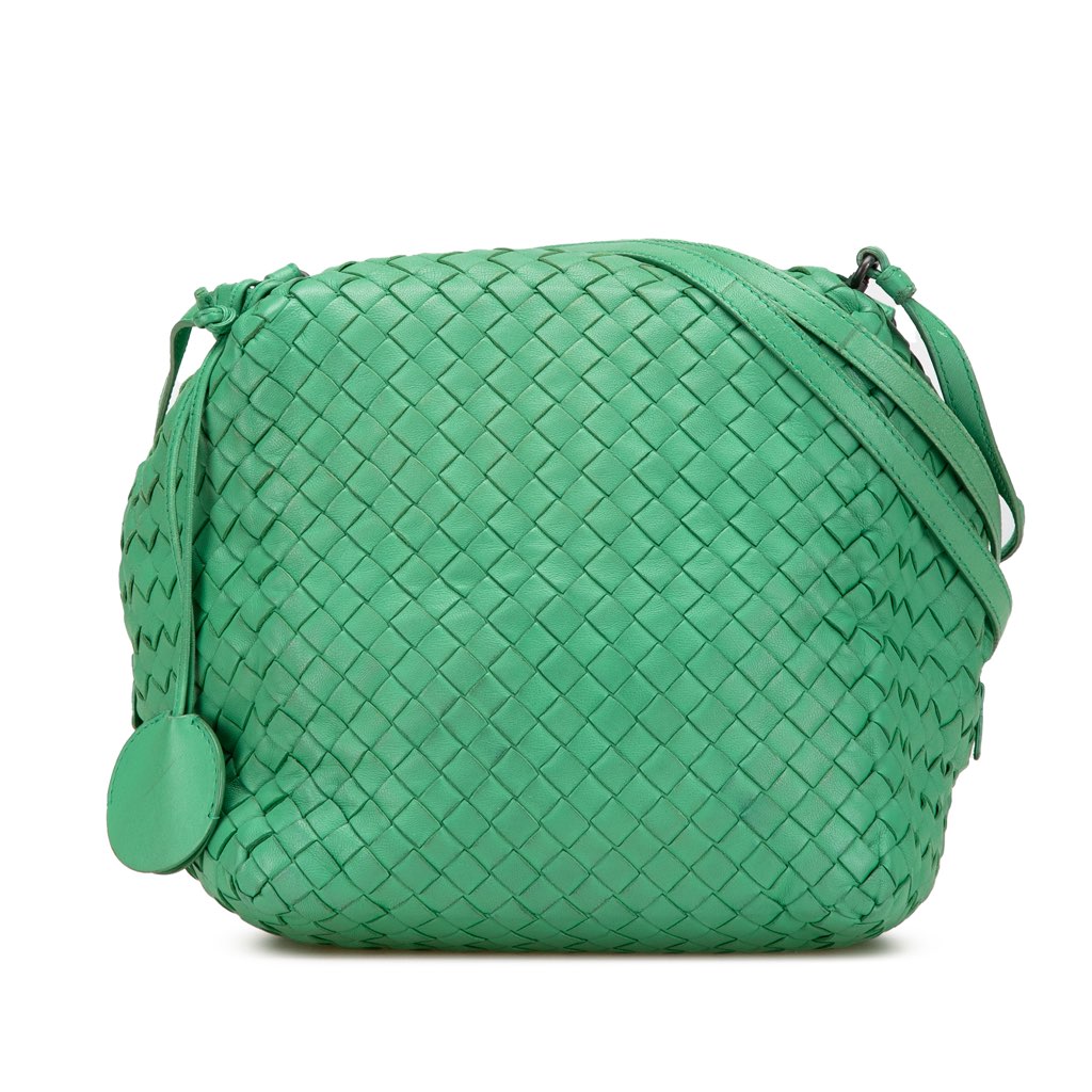 This crossbody bag features a woven nappa leather body, flat leather shoulder straps, dual top zip closures, and an interior zip pocket.