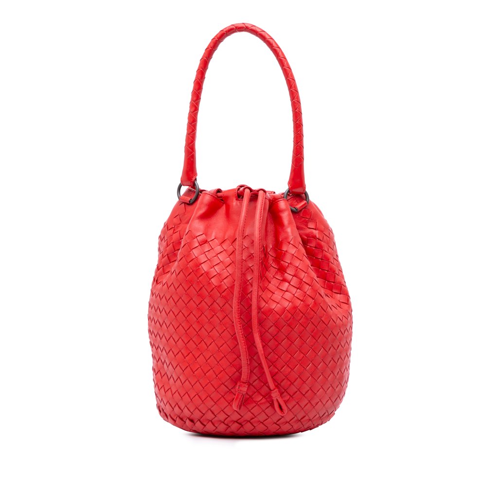 This bucket bag features a woven nappa leather body, a rolled leather handle, a top drawstring closure, and interior zip and slip pockets.