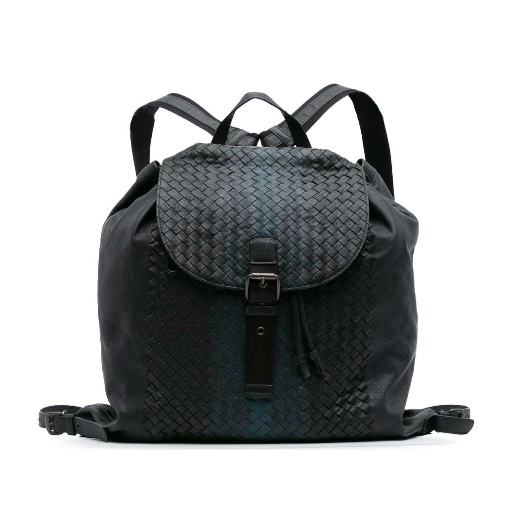 This backpack features a nappa leather body, a flat top handle, adjustable flat back straps, a front woven leather flap with buckle and drawstring closure, and an interior slip pocket.