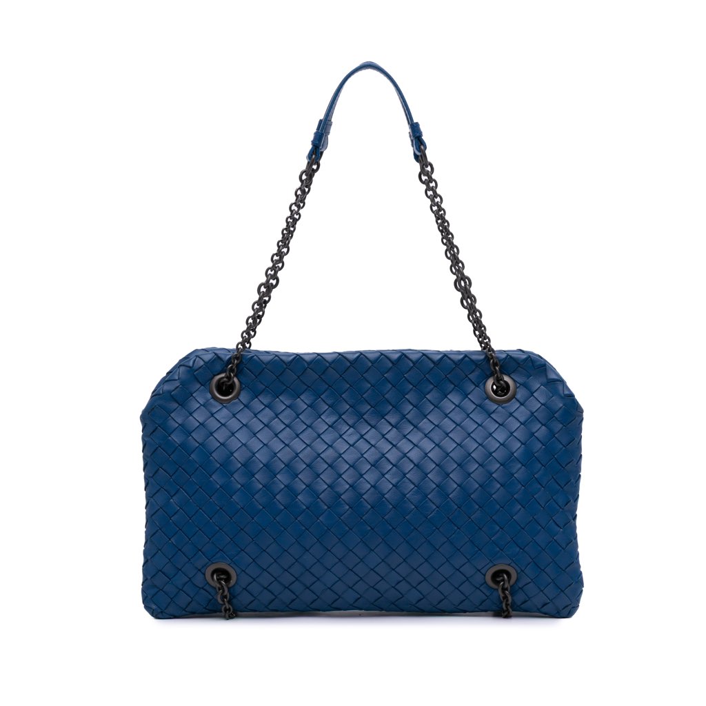 The Duo shoulder bag features a woven leather body, chain link straps with leather guard, and an open top with magnetic closure.