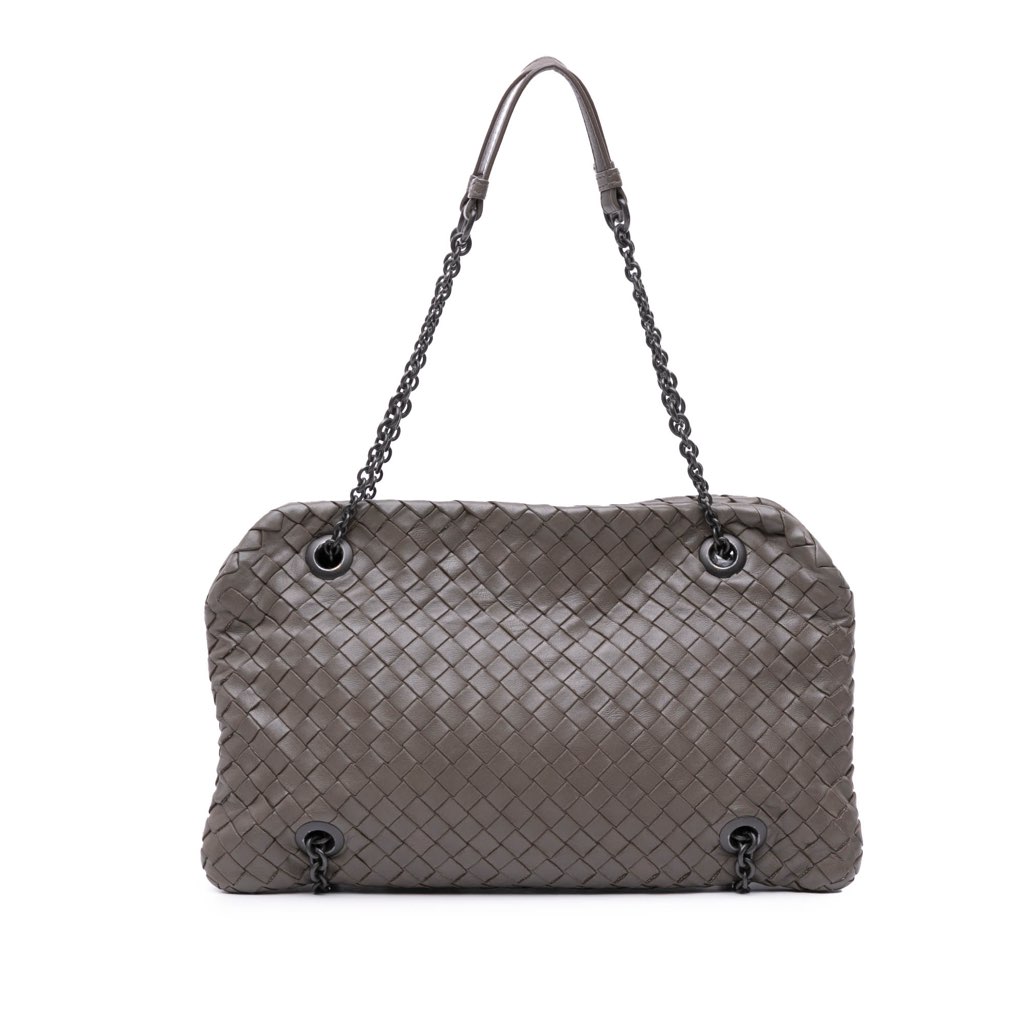 This shoulder bag features a woven leather body, chain link straps with leather guard, and open top with magnetic closures.
