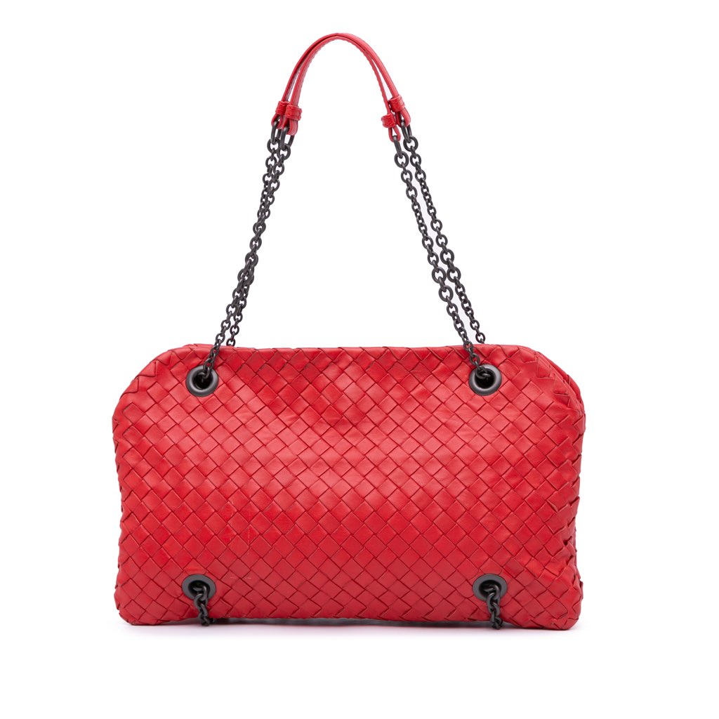 The Duo shoulder bag features a woven leather body, chain link straps with leather guard, and an open top with magnetic closures.