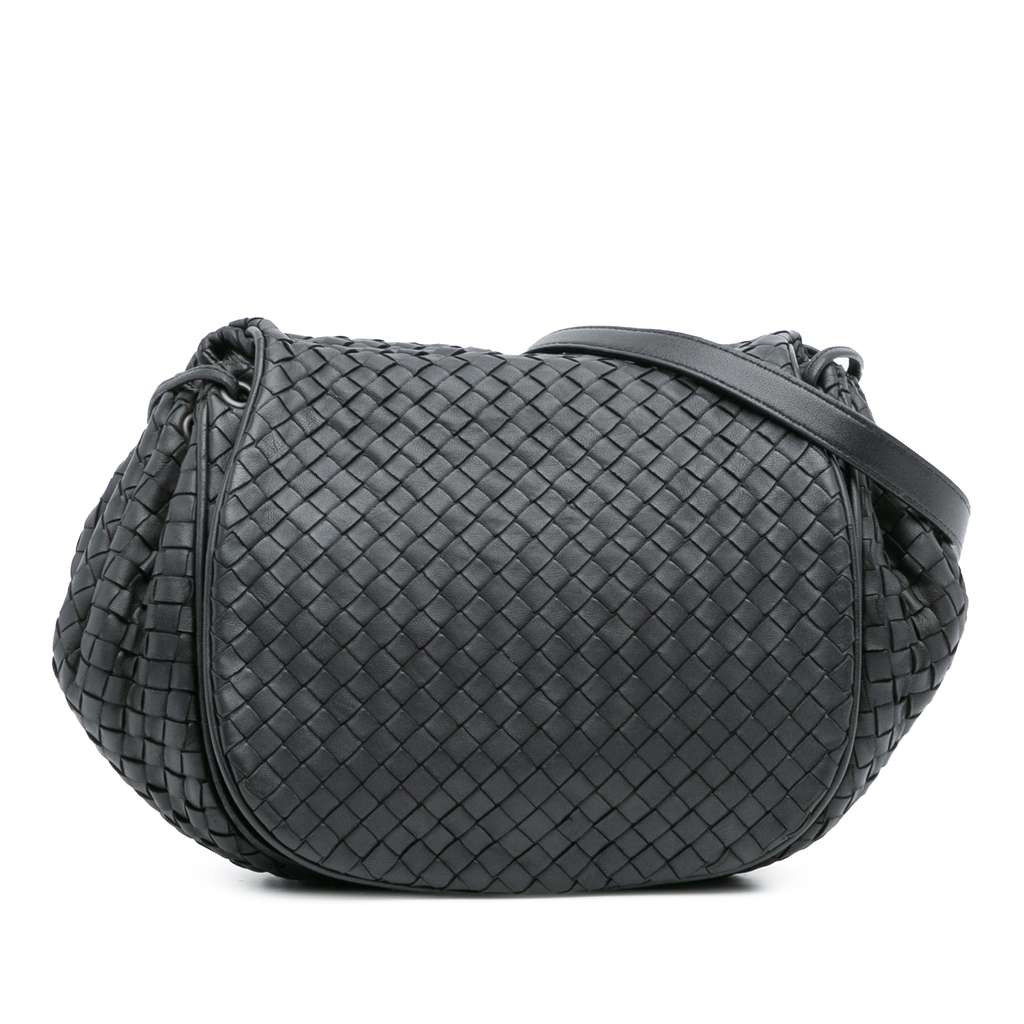 This crossbody features a woven nappa leather body, a flat strap, a front flap and drawstring closure, and interior zip and slip pockets.