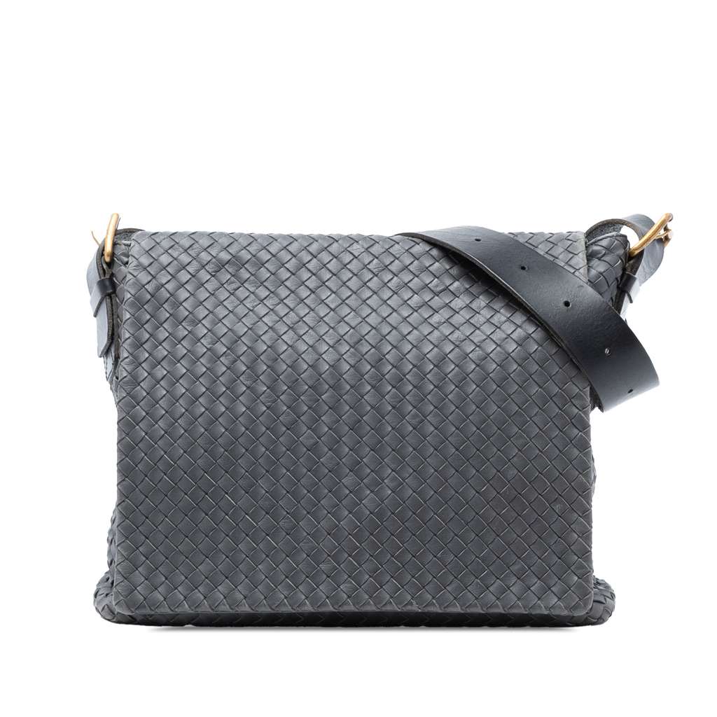 This crossbody features a woven nappa leather body, an adjustable flat leather strap, a front flap, a top zip closure, and an interior zip pocket.
