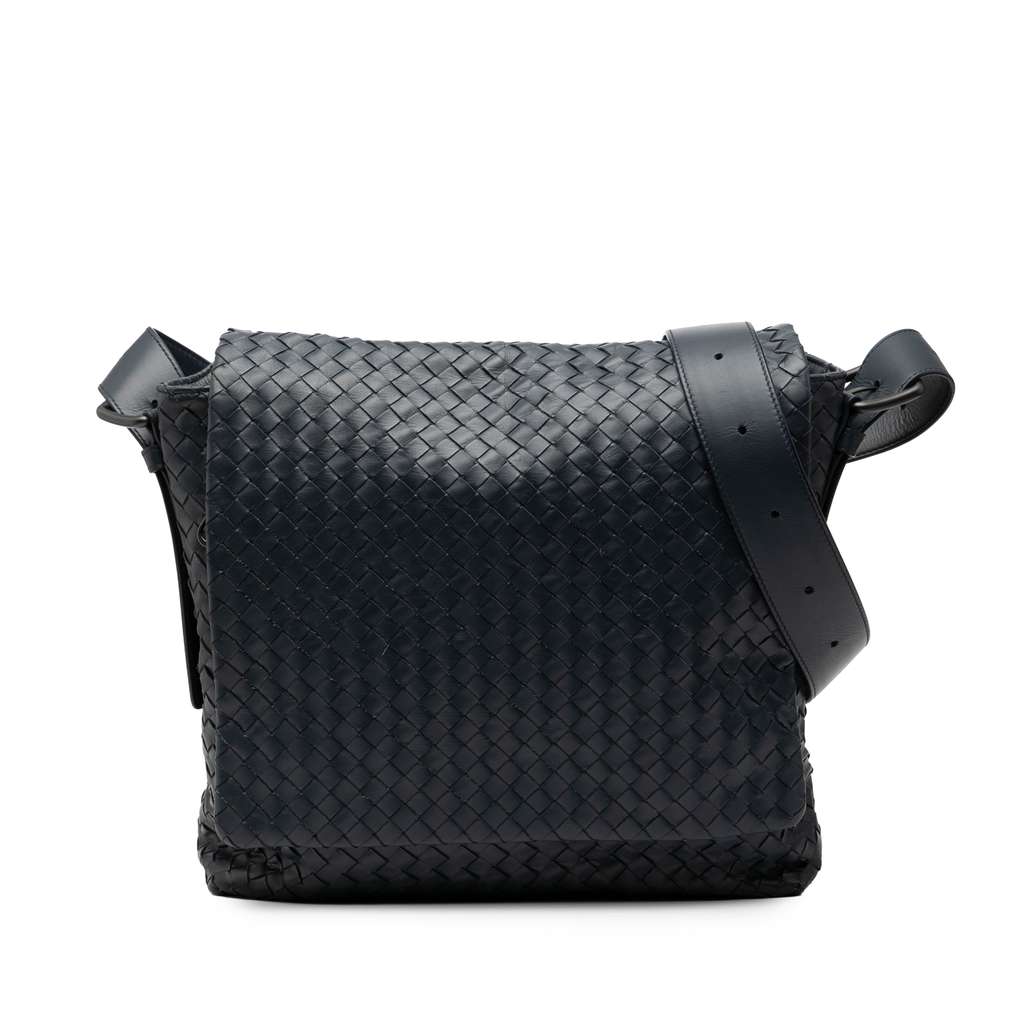 This crossbody bag features a woven nappa leather body, an adjustable flat leather shoulder strap, a front flap with magnetic closure, and an interior slip pocket.