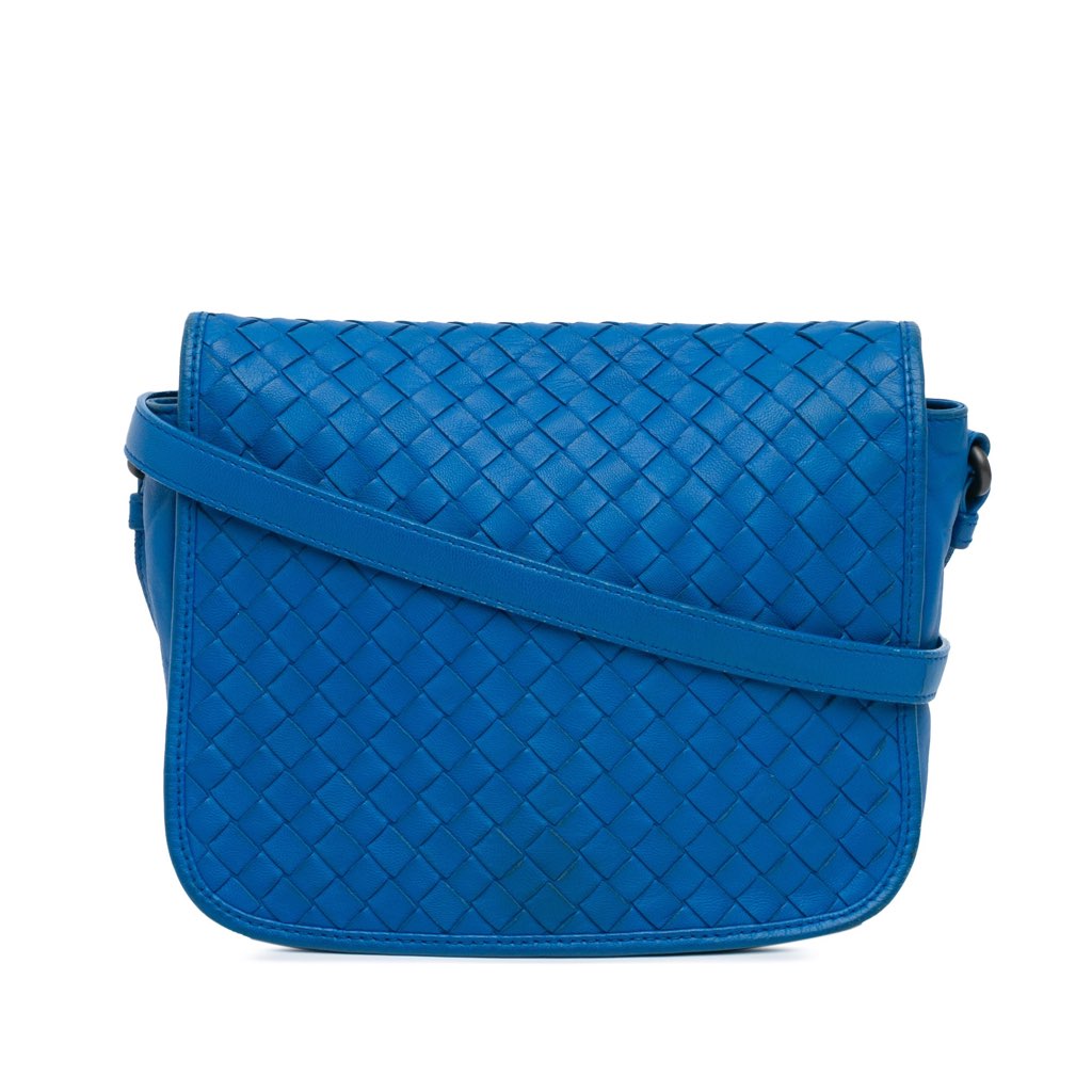 This crossbody features a woven leather body, a flat leather strap, a front flap with magnetic closure, and an interior zip pocket.