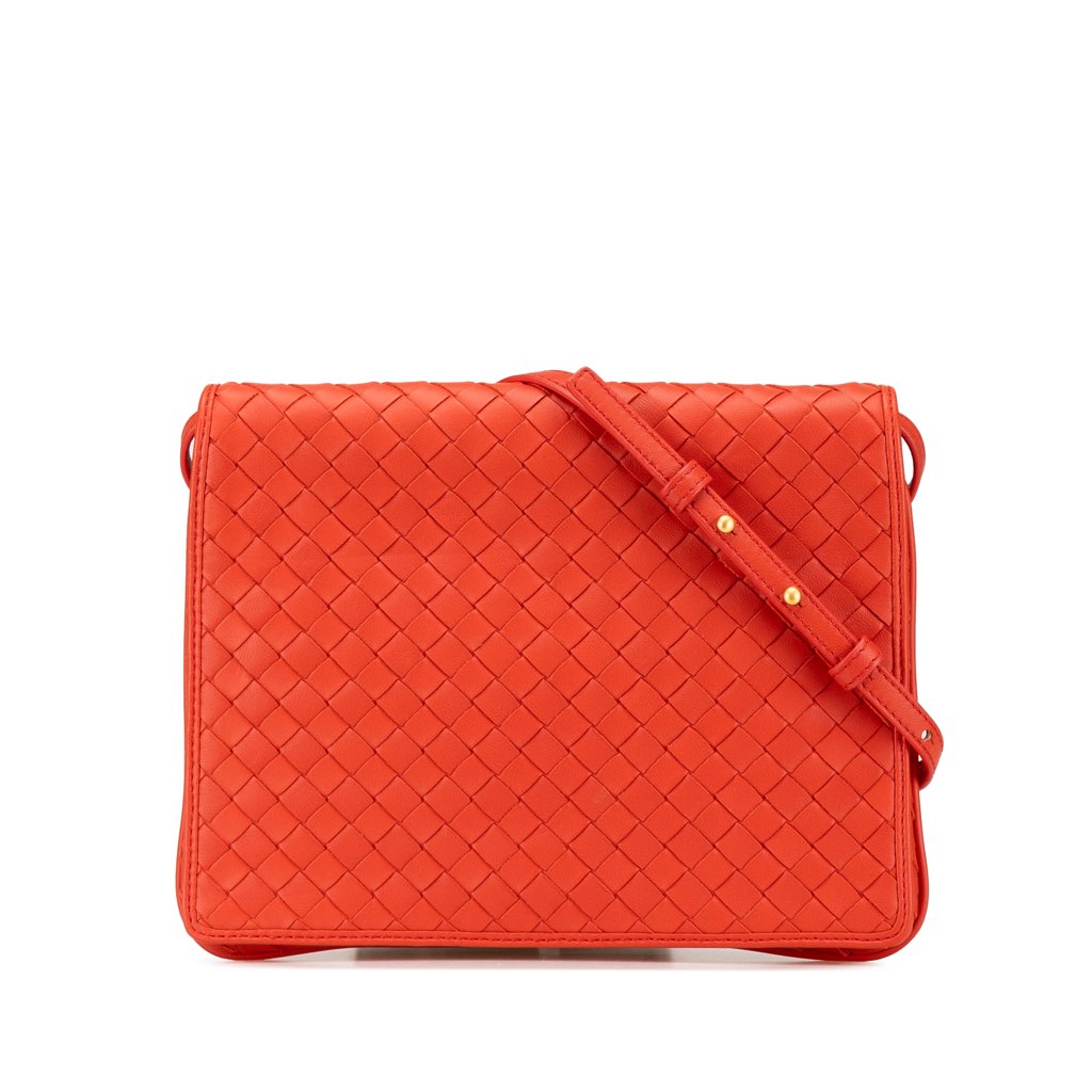 This crossbody bag features a woven nappa leather body, a flat leather shoulder strap, and a front flap with magnetic closure.