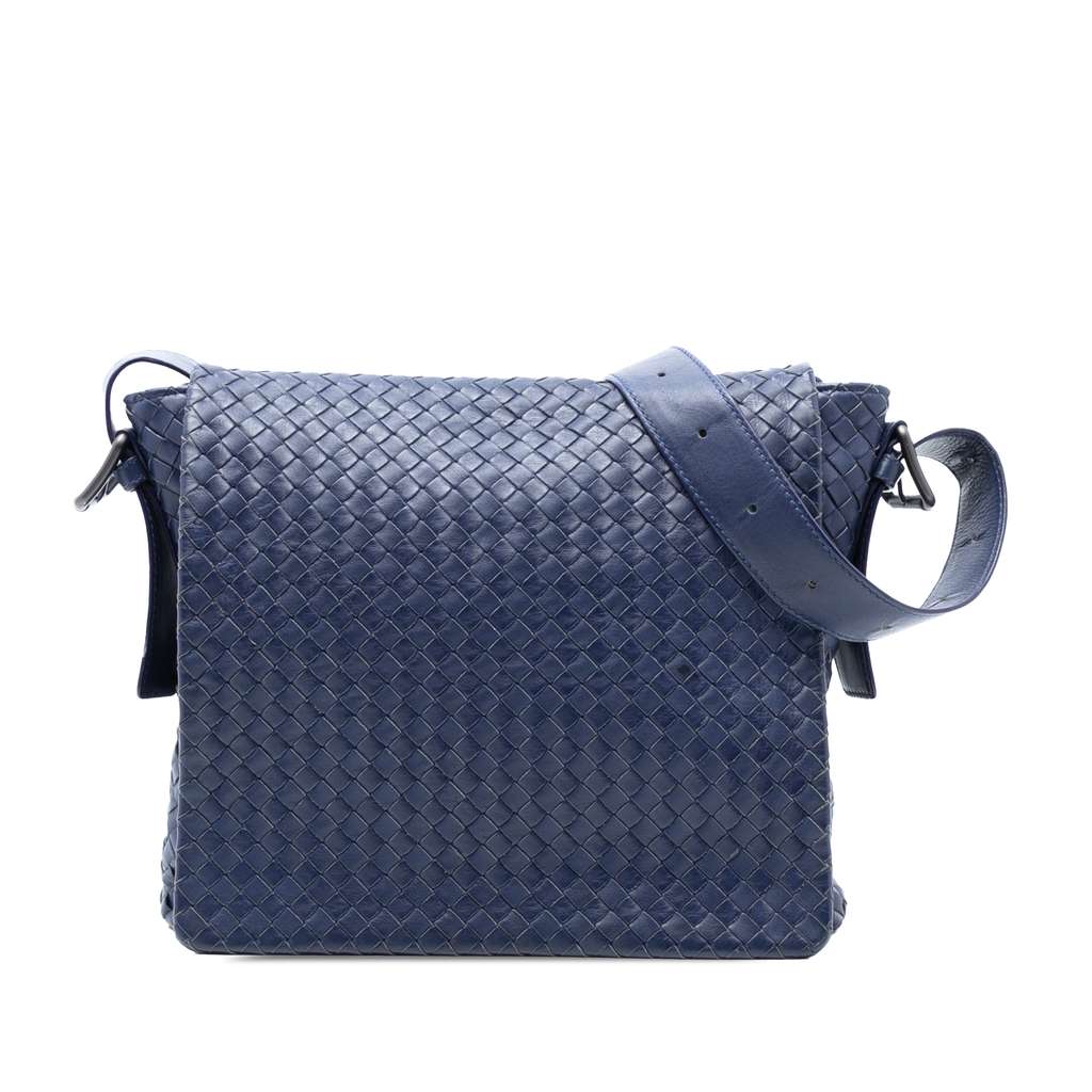 This crossbody bag features a woven nappa leather body, an adjustable flat leather shoulder strap, a front flap with magnetic snap closure, and an interior slip pocket.