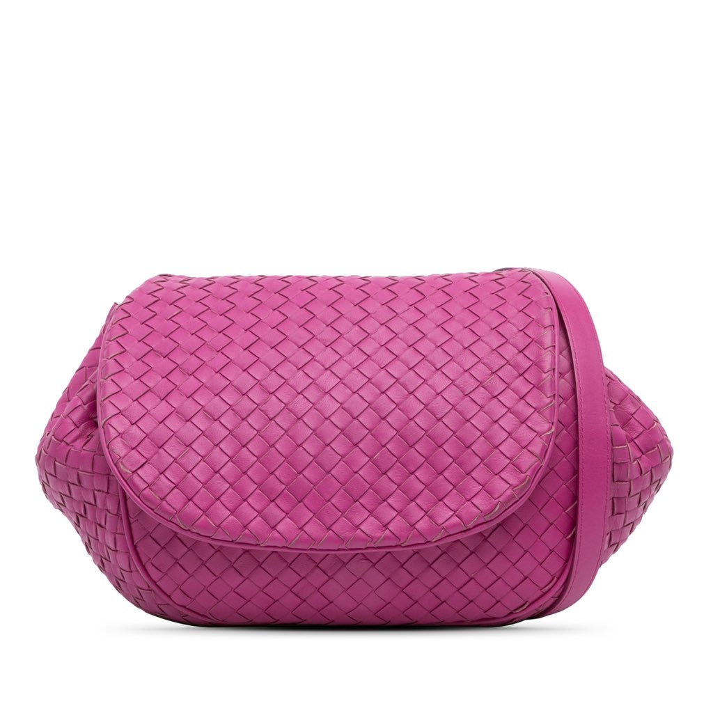 This crossbody features a woven nappa leather body, a flat strap, a front flap and drawstring closure, and interior zip and slip pockets.