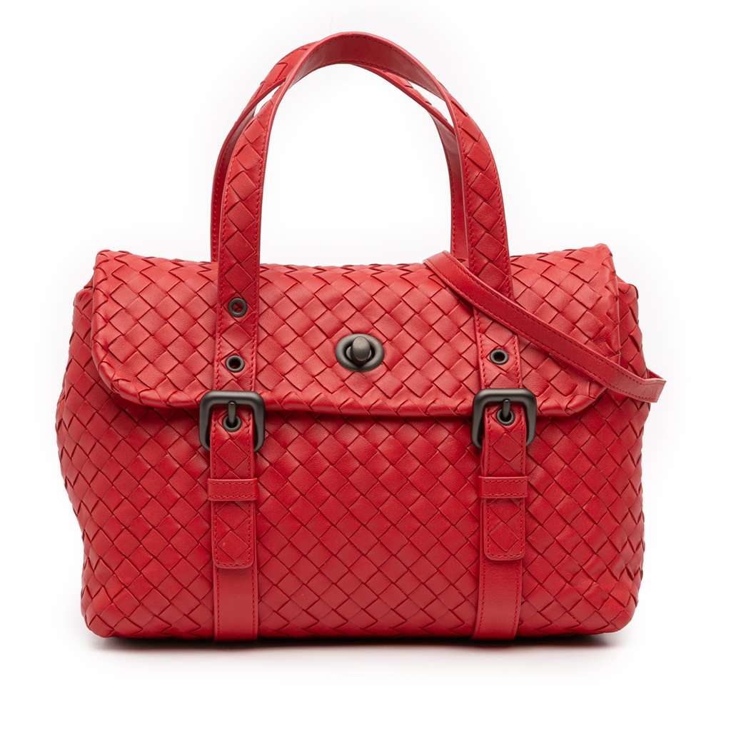 This satchel features a woven leather body, adjustable flat leather handles, a detachable strap, a front flap with twist lock closure, and an interior zip pocket.