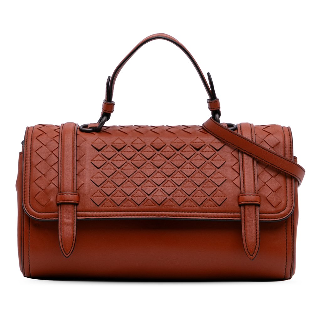This satchel features a nappa leather body with woven trim, a flat leather handle, a detachable flat leather shoulder strap, a front flap with magnetic snap closure, and an interior zip pocket.