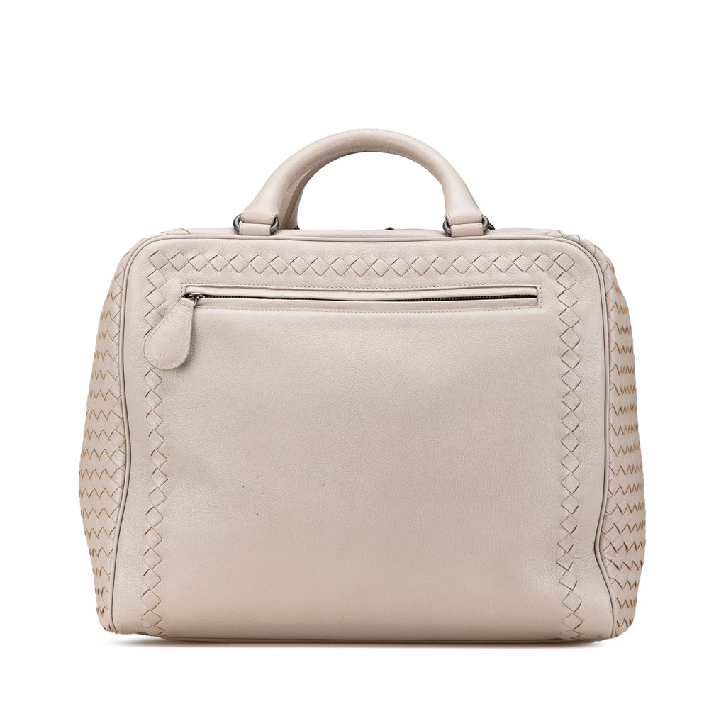 This handbag features a woven leather body, rolled leather handles, a top zip closure, exterior zip pockets, and an interior zip pocket.