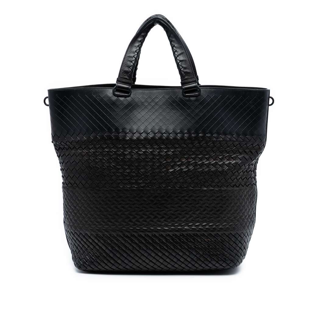 This satchel features a woven, embossed, and quilted leather body, flat leather handles, an open top, and an interior zip pocket.