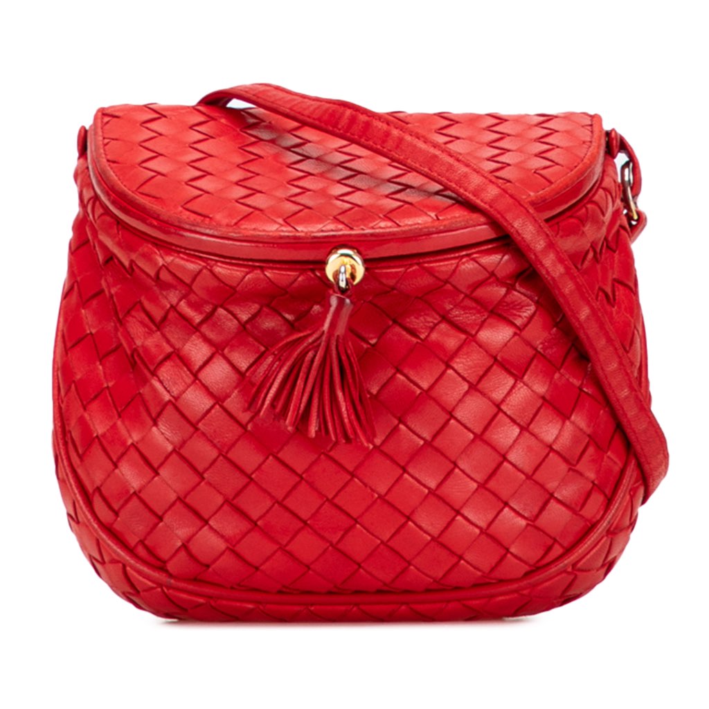 This crossbody features a woven leather body, flat leather shoulder strap, a front flap with push lock closure and tassel detail, and an interior slip pocket.