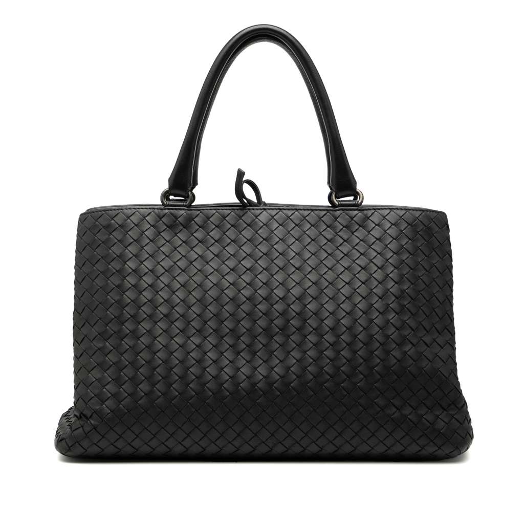 This tote bag features a woven nappa leather body, rolled leather handles, an open top with a leather tie knot closure, an interior compartment, and interior zip and slip pockets.
