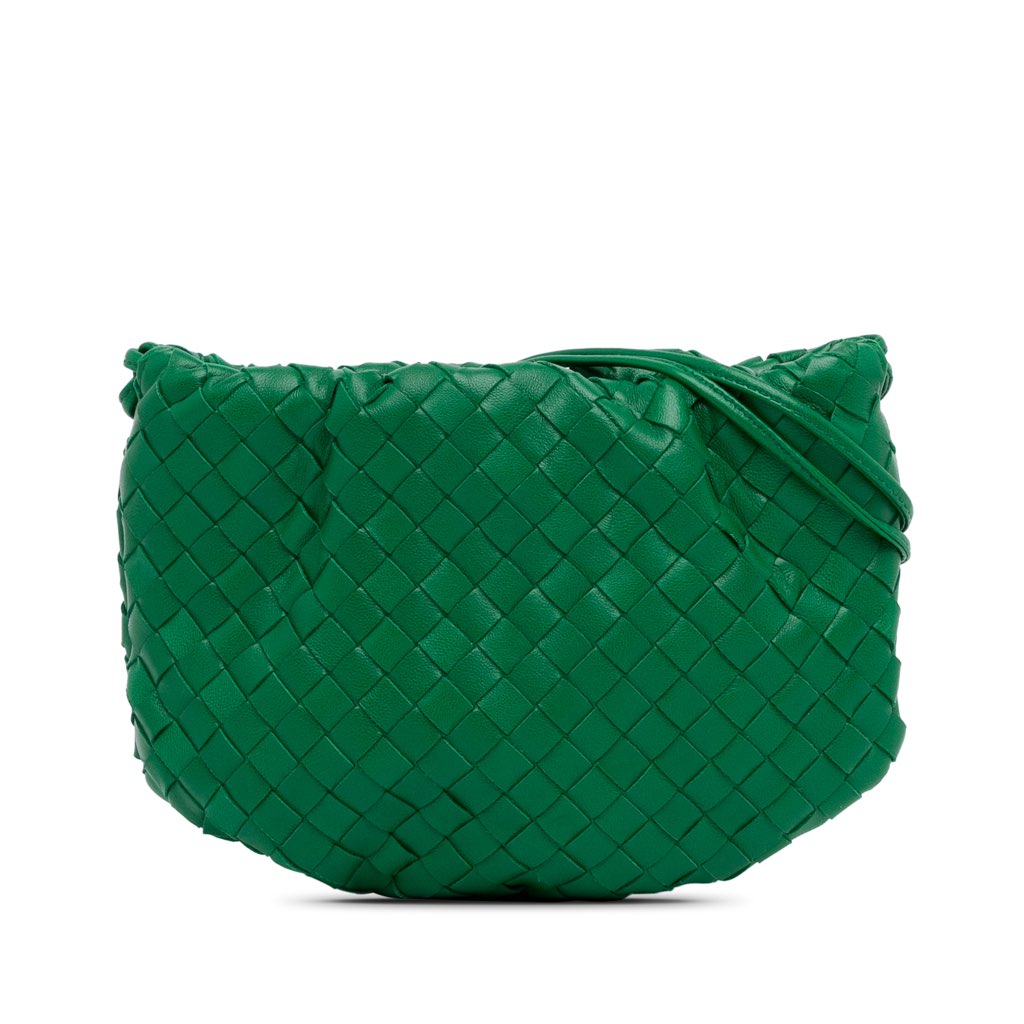 This crossbody bag features a woven nappa leather body, flat shoulder straps, and an open top with drawstring closure.