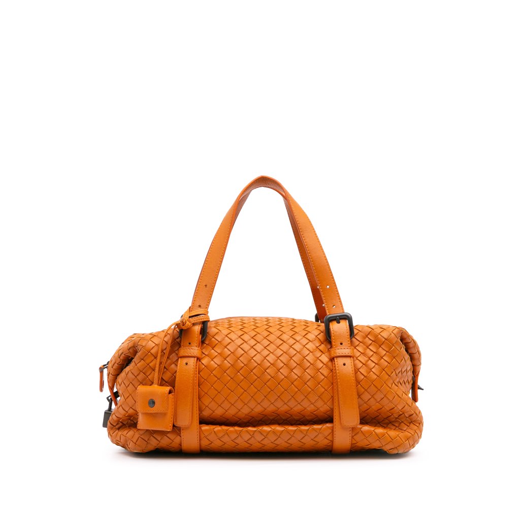 The Montaigne features a woven nappa leather body, flat leather straps, a top zip closure, and interior zip and slip pockets.