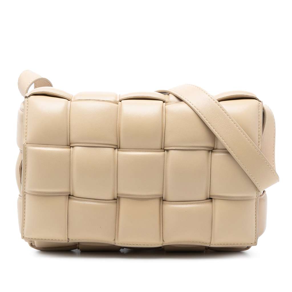 The Padded Cassette features a woven nappa leather body, an adjustable flat leather shoulder strap, a flap with push lock closure, and an interior zip pocket.