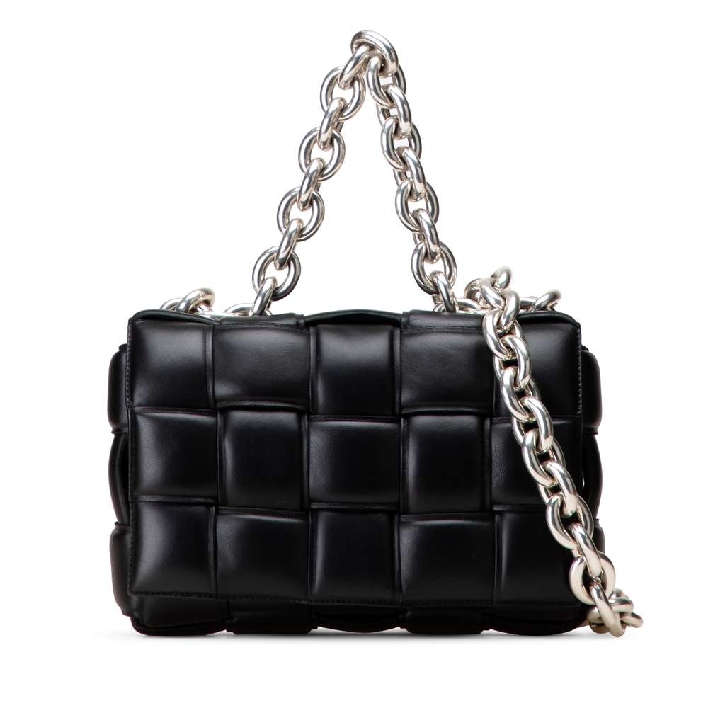 The Padded Cassette features a woven nappa leather body, a chain link handle and straps, a front flap with magnetic snap button closure, and an interior zip pocket.