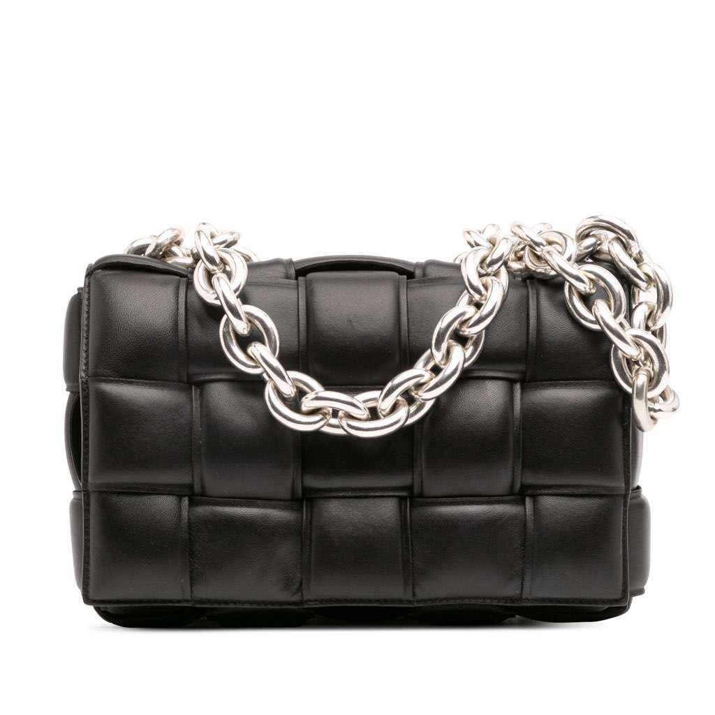 The Padded Cassette features a woven nappa leather body, a chain link handle and strap, a front flap with magnetic snap button closure, and an interior zip pocket.