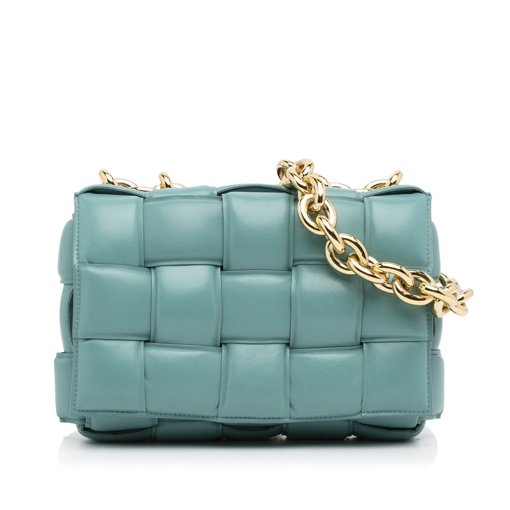 The Padded Cassette features a woven leather body, a gold-tone chain handle and strap, a front flap with magnetic snap button closure, and an interior zip pocket.