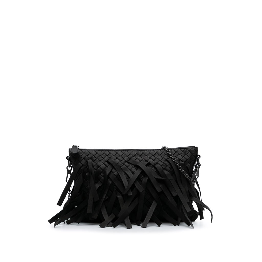 This crossbody bag features a woven leather body with fringe details, a chain link strap, a top zip closure, and interior slip pockets.