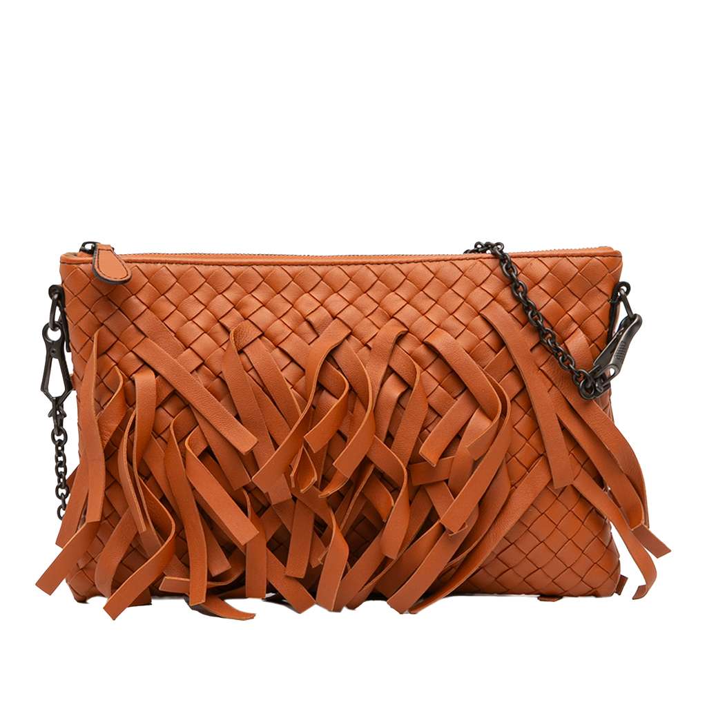 This crossbody bag features a woven leather body with fringe details, a chain link strap, a top zip closure, and interior slip pockets.